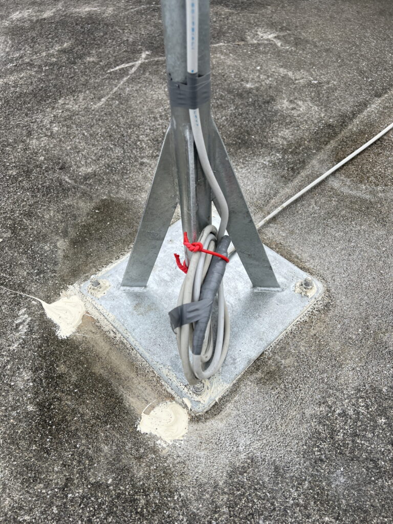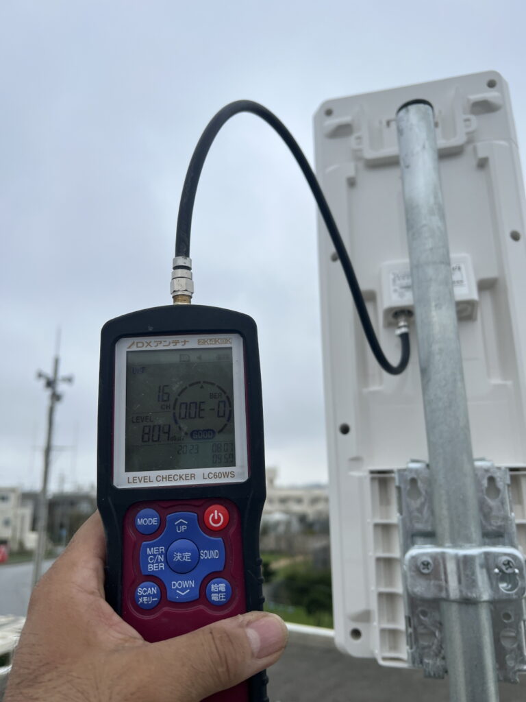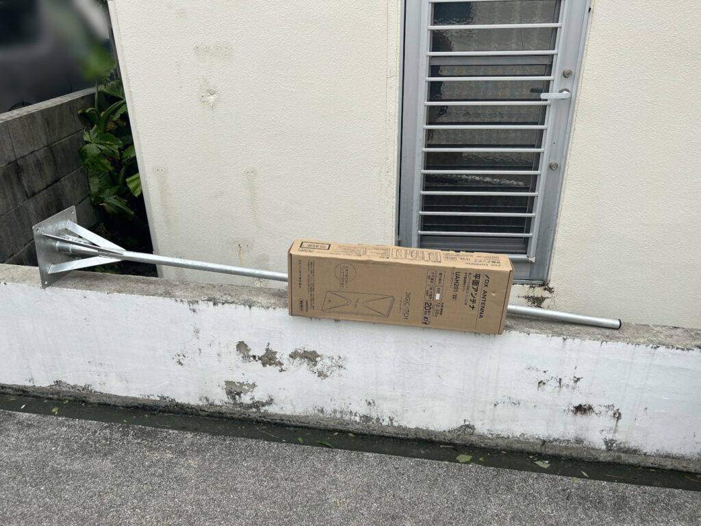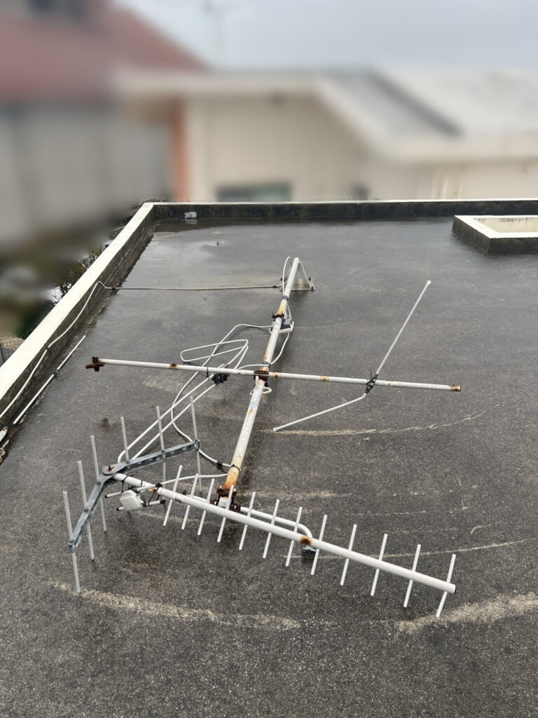 アンテナ工事 自立型マスト、デザインアンテナ 本日は南風原町、T様宅のアンテナ取付の工事をさせて頂きました。先日の台風6号による強風で、倒壊したアンテナです。 今回の地デジアンテナは、通常の八木式から、デザインアンテナに変更です。 自立マストも、新設しました。古いアンカーの跡にはコーキング盛りもりです。 強電界地域は、安心して工事ができます。レベル確認ヨシッ! 自立マストへ、デザインアンテナを設置完了しました。この度は、新垣企画への地デジアンテナ取り付け、ご依頼有難うございました。